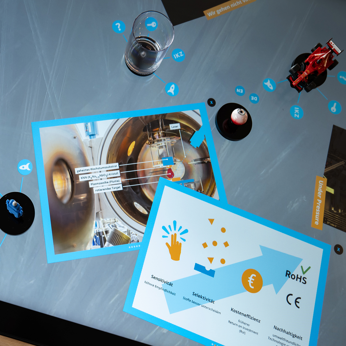 Main object is a touchscreen table with object recognition. Each object represents familiar technical products or physical phenomena. Multimedia applications connect the institute’s work with the challenges associated with each object.